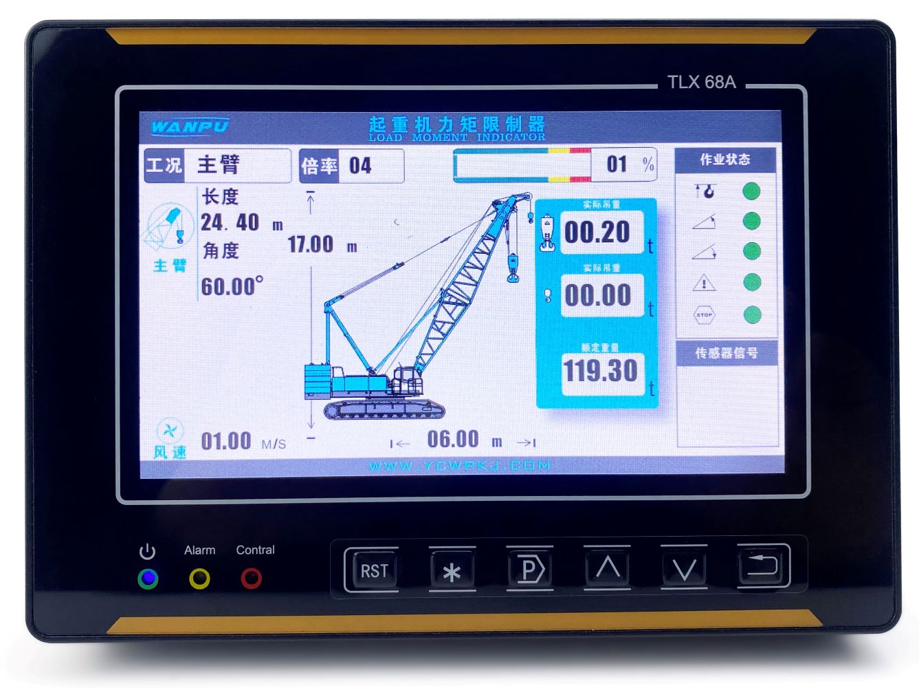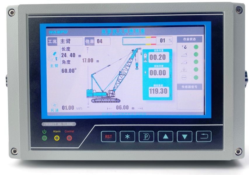 履帶式起重機力矩限制器主要由力矩限制器顯示器、主機、角度傳感器、重量傳感器等組成。通過各傳感器檢測信號,可以實時在顯示器上顯示起重機的額定起重量、實際起重量、臂長、角度等信息,并根據情況輸出報警信號和控制信號,輔助作業人員安全操作起重機。